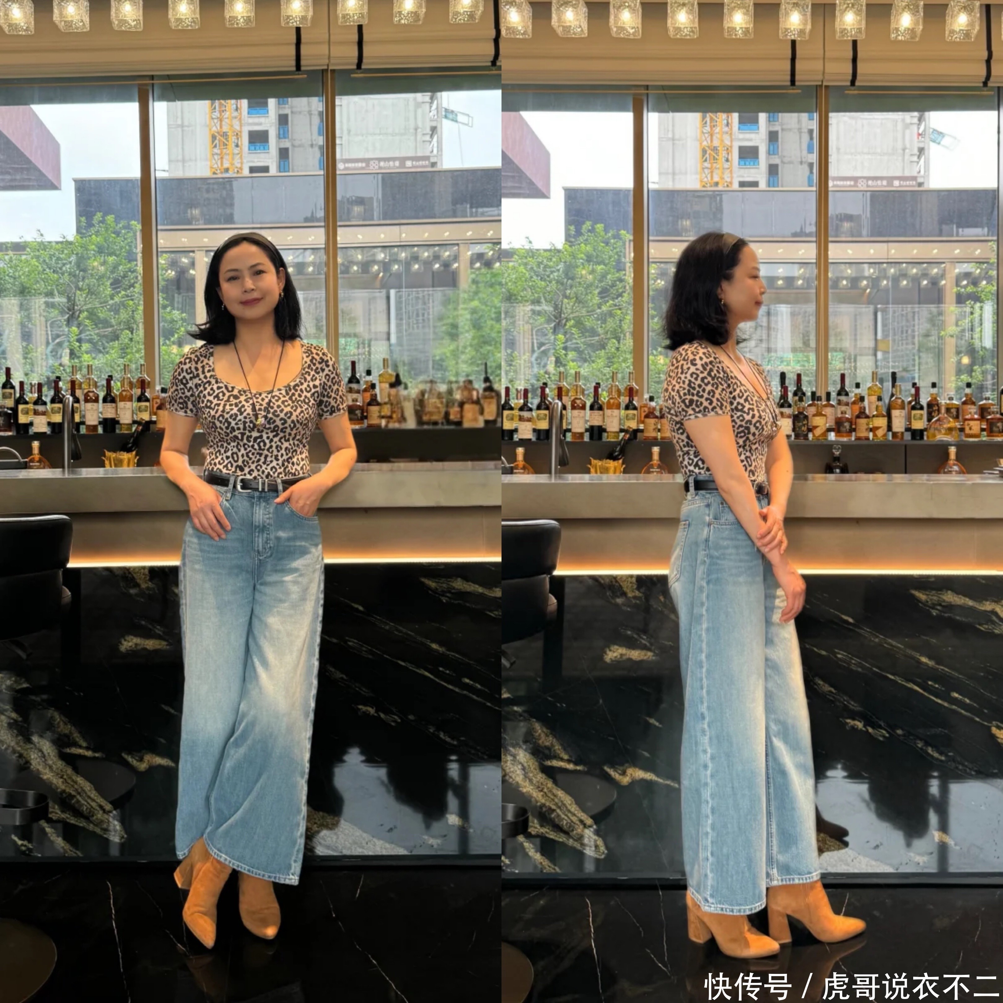 豹纹修身T恤野性中透着轮廓,大方领诡计玄妙露肤,勾画肩颈线条;搭配九分牛仔阔腿裤,利落剪裁均衡上半身的张扬感,一松一紧间突显身材弧线。全体造型既有闇练女性的柔媚,又不失洒脱随意,50+穿出别样文静气场。