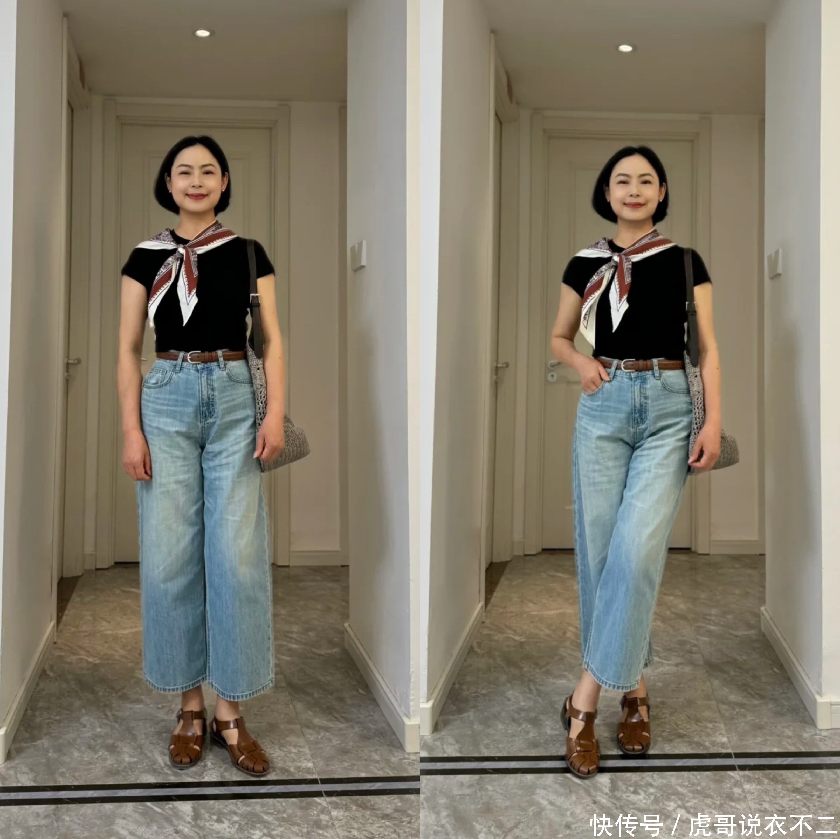 玄色T恤的千里稳利落,遇上九分牛仔阔腿裤的洒脱大气,棕色腰带束出高腰线,凉鞋与腰带色调呼应更显巧想,脖颈间小丝巾细微飘舞,蓦的突破基础款的单调,一抹亮色点缀,让50+女性的安闲穿搭轮廓感与高档感同期在线。