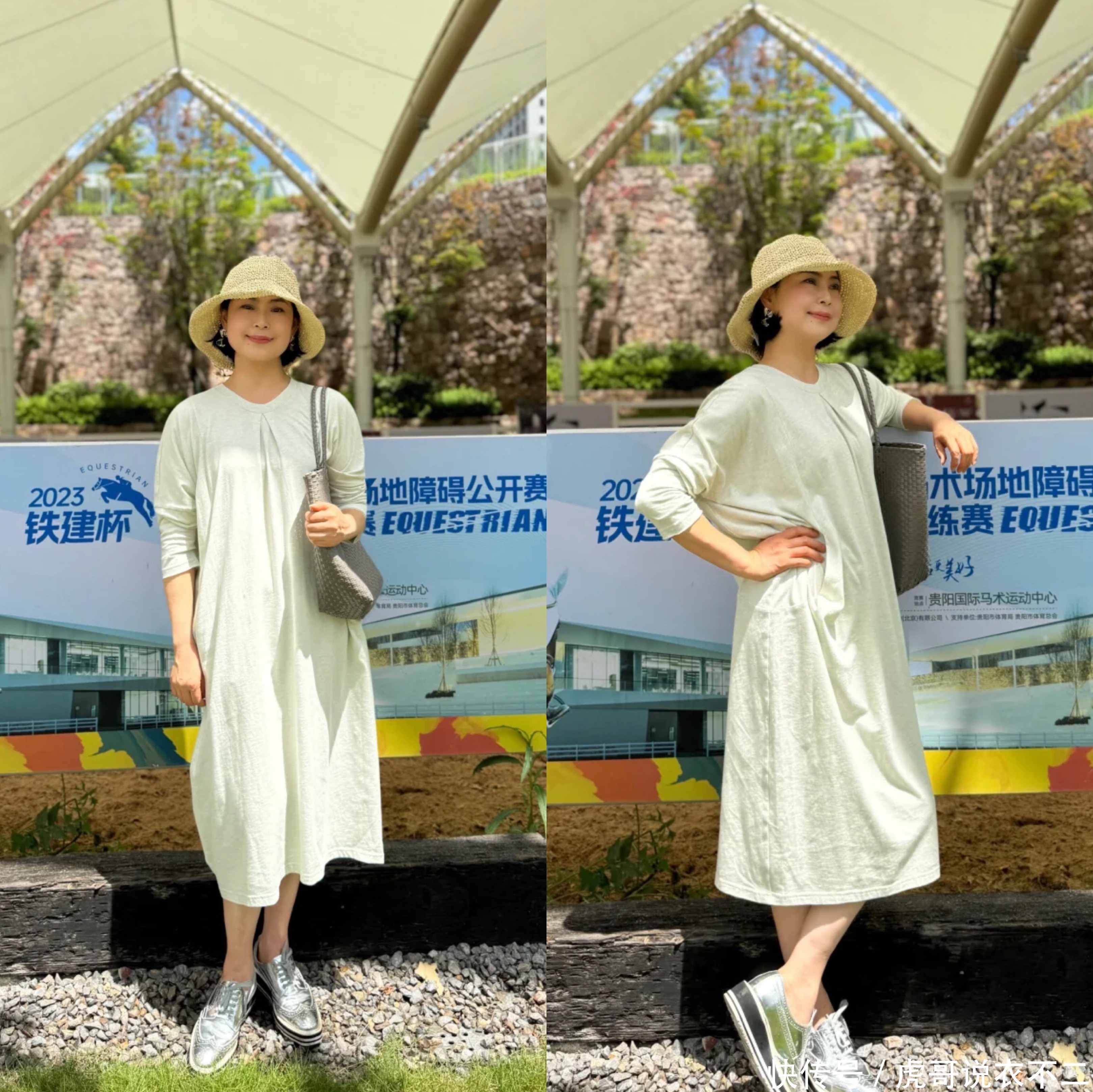 浅抹茶色懒东谈主裙自带善良滤镜,宽松版型玄妙藏住腰腹赘肉,舒适无敛迹;小圆领与中袖诡计从简多礼,勾画颈部线条又修饰手臂。搭配一对淡色平底凉鞋,拎个草编包,50岁女性穿出松弛又崭新的夏令氛围,慵懒却很显气质。