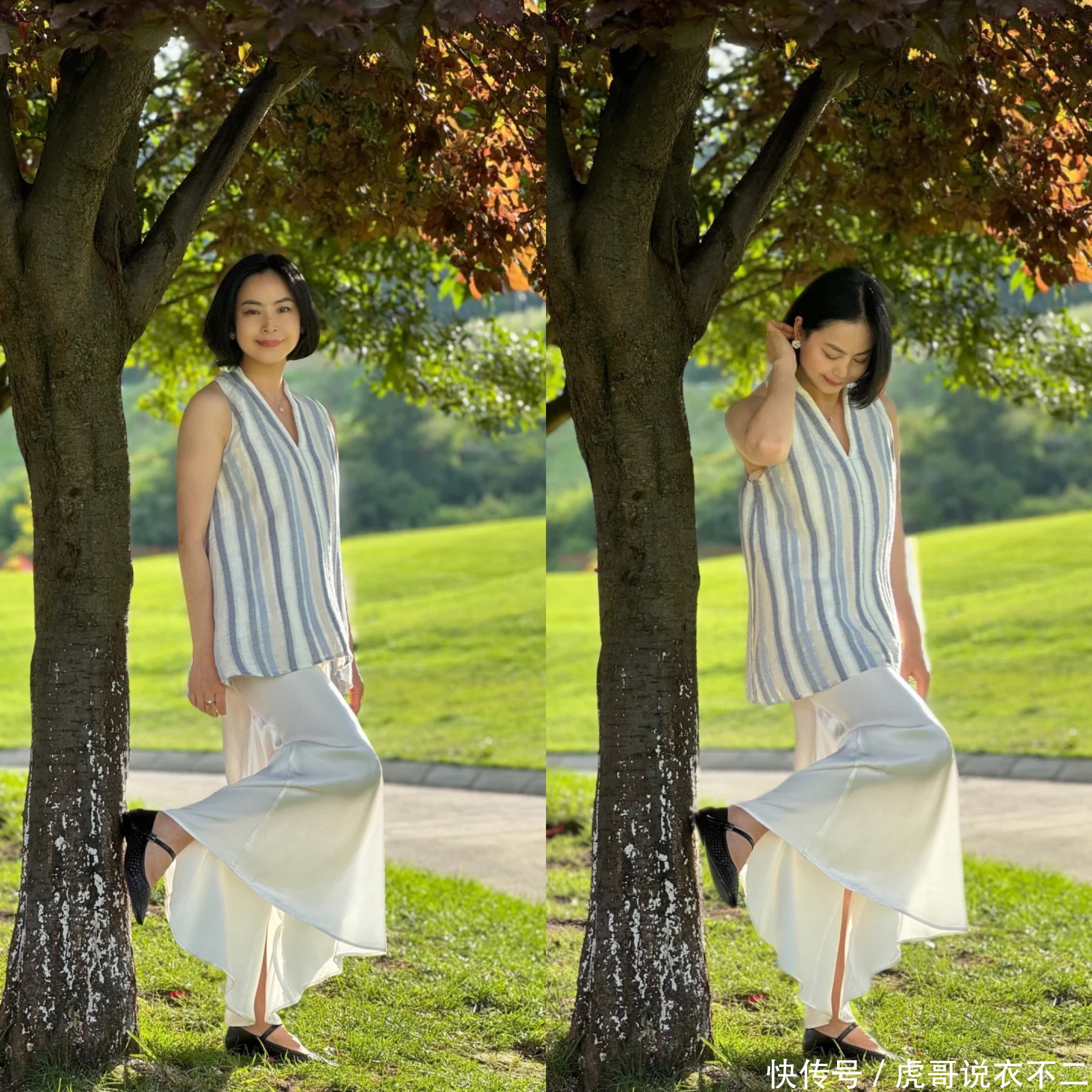 棉麻无袖上衣的竖条纹自带显瘦魔法,透气又随意;搭配米色缎面半裙,柔嫩明后与质朴棉麻碰撞出高档感。整套穿搭的廓形均衡,脚踩玄色尖头鞋延迟腿长,50岁女性穿出松弛有度的优雅,夏令通勤或麇集都气质满分。