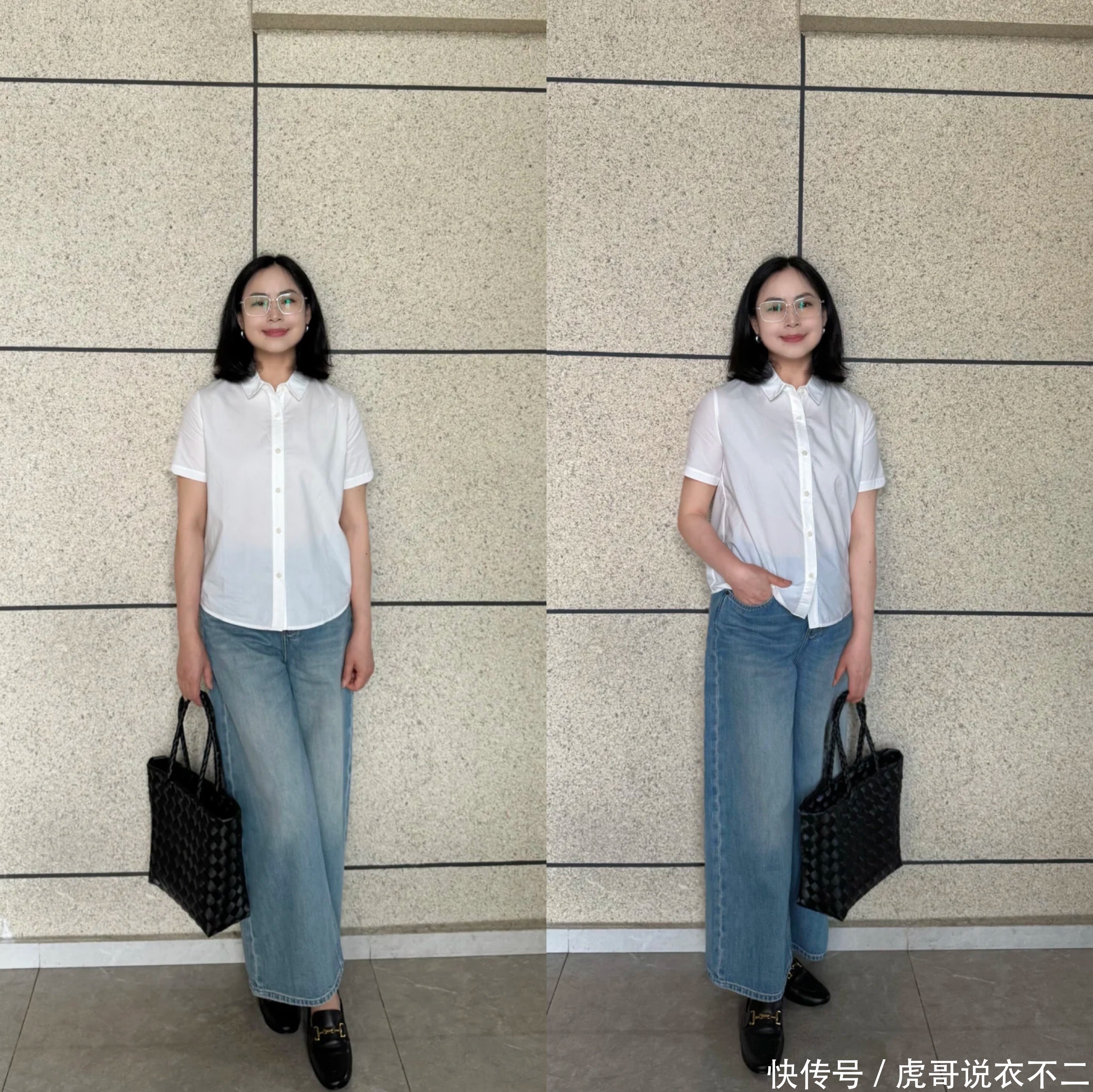白衬衫的干净利落,碰撞九分牛仔阔腿裤的洒脱随意,经典蓝白配自带崭新滤镜,吸收轮廓的小领型诡计突破刻板,微微收腰的版型不错加多弧线感,直筒牛仔阔腿裤拉长腿部线条,九分裤长知道纤细脚踝,通勤麇集都宜,粗糙发挥50+女性从简不轻视的文静立场。
