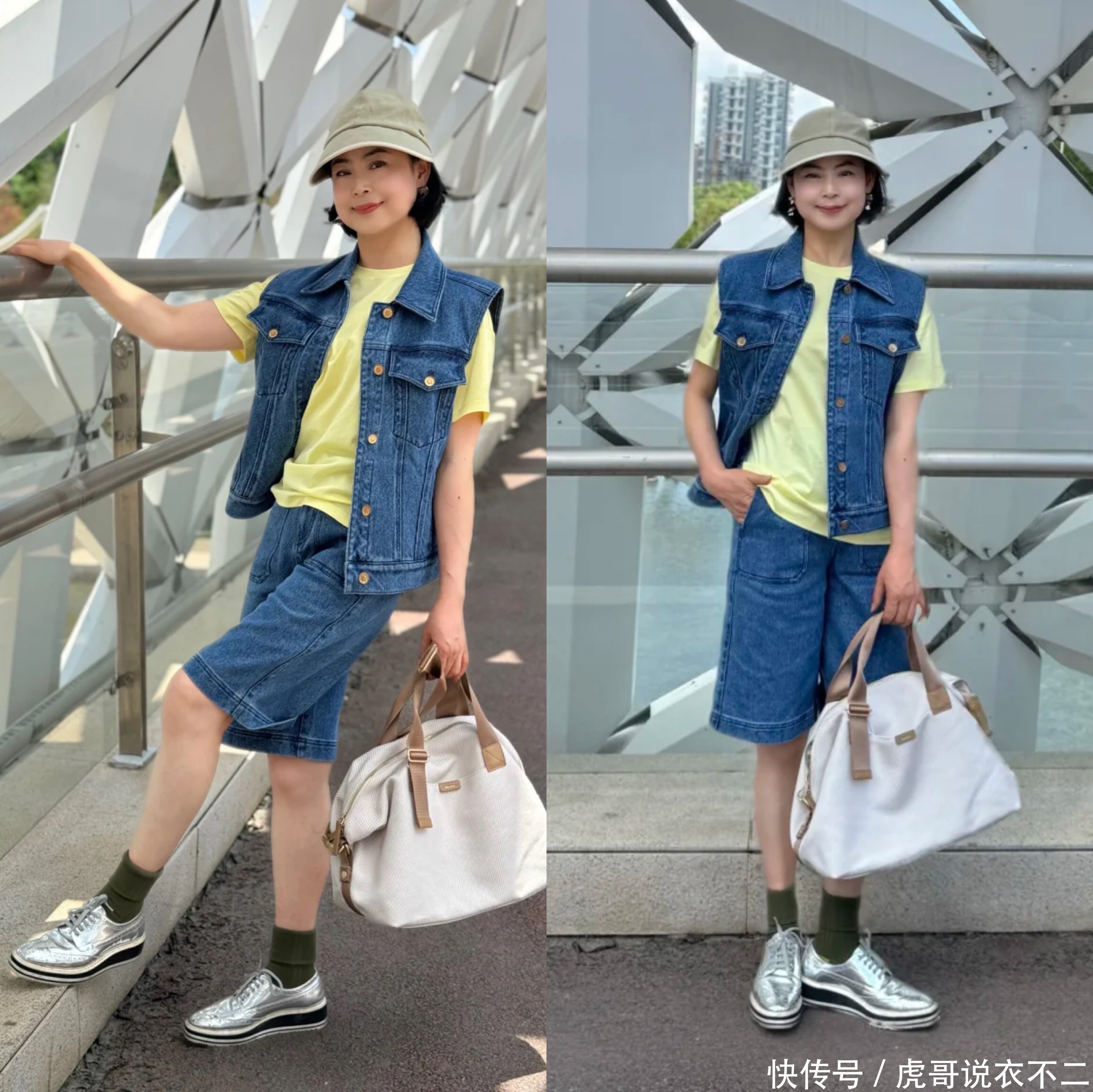 牛仔马甲与五分短裤的同材质套装,自带洒脱随意基因,内搭亮黄色T恤蓦的点亮全体——澄澈蓝调碰撞活力黄,档次分明又不失协作感。脚踩一对小白鞋,50岁女性穿出减龄不刻意的文静,安闲出游或普通逛街都适配。