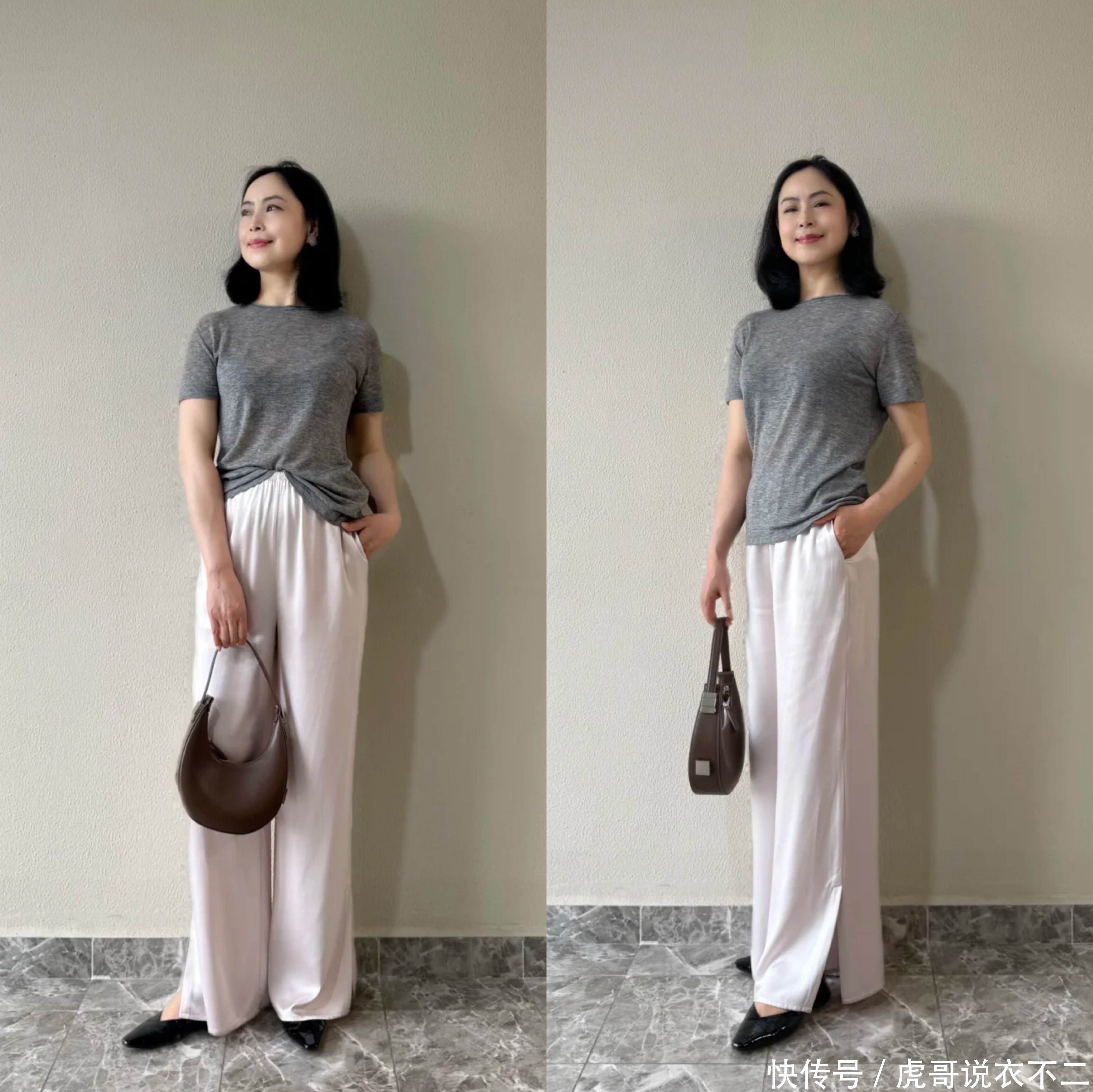 灰色T恤的低调内敛,遇上米色安闲裤的善良精雅,缎面材质的加入让全体蓦的灵动洒脱——垂感面料当然勾画体态,行走间泛着轻柔明后,既保留了安闲装的舒适感,又以轮廓质感突破千里闷,粗糙演绎50+女性的随意文静。