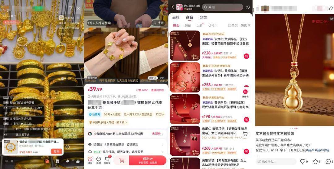 记者搜索发现,不少店铺都把黄金珠宝首饰的热销容颜作念成了铜合金版块,其中微辞不错看见老铺黄金、卡地亚、梵克雅宝等品牌的影子,但价钱不错低至三四十元。头部铜艺品牌朱炳仁·铜也推出了铜吊坠、项链等居品,单品售价多在100-400元之间。
