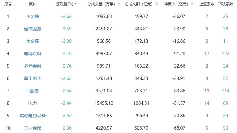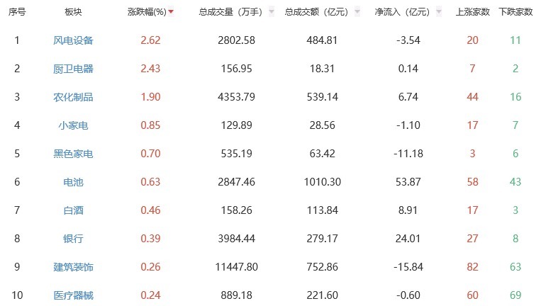 板块方面,风电配置、厨卫电器、农化成品等板块涨幅居前,小金属、通讯业绩、贵金属等板块跌幅居前。